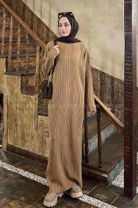 Lamelif Balon Kol Katlı Tesettür Elbise Acı Kahve