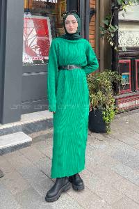 Lamelif Fitilli Triko Uzun Elbise Yeşil