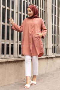 Modalamelif Gizli Cep Düşük Kol Gömlek Gül