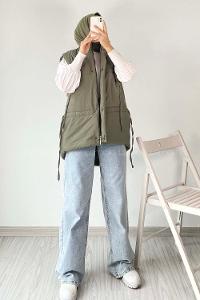 Modalamelif Gizli Fermuarlı Çift Cepli Yelek Haki