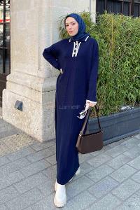 Lamelif Gold Düğme Detaylı Triko Elbise Lacivert