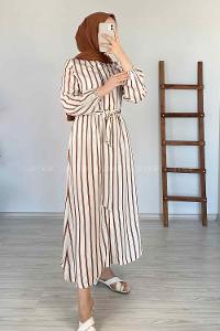 Modalamelif Gömlek Yaka Çizgili Elbise Kahve