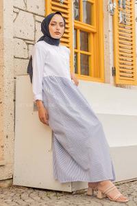 Modalamelif Hakim Yaka Çizgili Elbise Saks Mavisi
