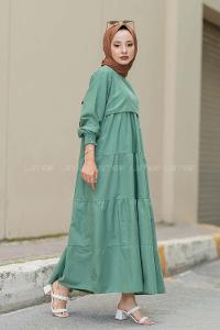 Lamelif Ön Yarım Düğme Detaylı Müslin Kumaş Tesettür Elbise Açık Yeşil