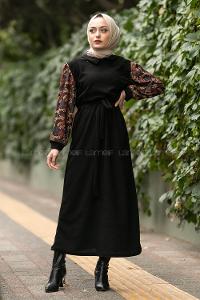Lamelif Balon Kol Katlı Tesettür Elbise Siyah