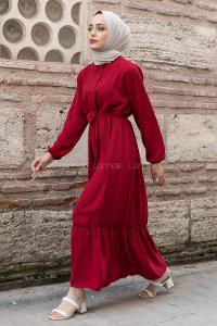 Lamelif Balon Kol Katlı Tesettür Elbise Bordo