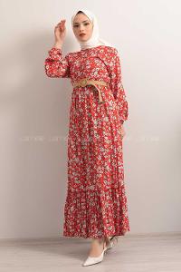 Modalamelif Hasır Kemerli Çiçek Desenli Kırmızı