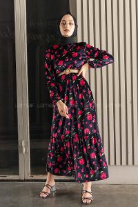 Modalamelif Kemerli Gül Desen Kadife Elbise Lacivert
