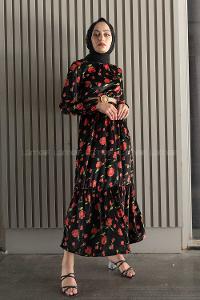 Modalamelif Kemerli Gül Desen Kadife Elbise Siyah