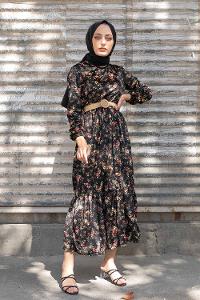 Lamelif Balon Kol Katlı Tesettür Elbise Siyah