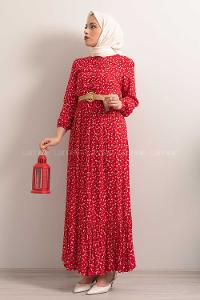 Modalamelif Hasır Kemerli Minimal Papatya Desen Elbise Kırmızı