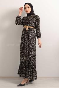 Lamelif Balon Kol Kemerli Tesettür Elbise Siyah