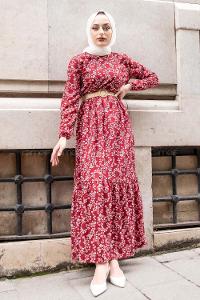 Modalamelif Hasır Kemerli Minimal Papatya Elbise Bordo