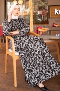 Lamelif Balon Kol Katlı Tesettür Elbise Siyah