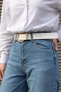 lamelif Hasır Örgü Tokalı Altın Sarısı Kemer Beyaz