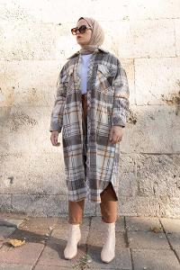 ön düğmeli, ekose desen, çift cep detaylı kap