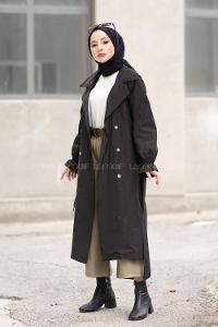 Lamelif Gold Düğmeli Bağlamalı Tesettür Kaban Siyah
