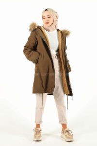 Modalamelif İçi Kürklü Arkası Süs fermuar Detaylı Kaban Haki