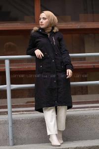 Lamelif Kemerli Kürk Yaka Kaban Siyah