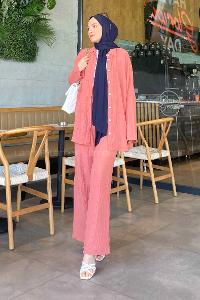Lamelif İkili Gofre Tesettür Takım Pembe