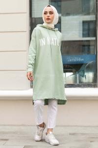 Modalamelif In Nature Yazı Baskılı Kapüşon Detaylı Uzun Tunik Çağla