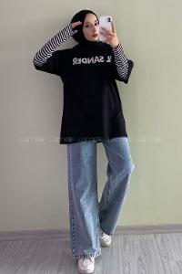 Lamelif Dilvin 30312 Dekoratif Dikişli Bisiklet Yaka Tshirt-Siyah