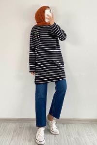Modalamelif Kaktüs Nakışlı Çizgili Tunik Siyah