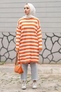 Modalamelif Kalın Çizgi Şeritli Triko Tunik Oranj