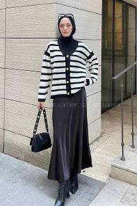 Lamelif Kalın Çizgili Yumoş Hırka Beyaz -Siyah