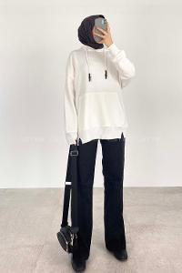 Lamelif Kapşonlu Oversize Yan Cepli Sweat Beyaz
