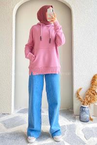 Lamelif Kapşonlu Oversize Yan Cepli Sweat Pudra