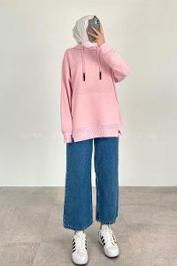 Lamelif Kapşonlu Oversize Yan Cepli Sweat Pudra