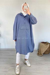 Modalamelif Kanguru Cep Pötikare Kapşonlu Tunik Mavi