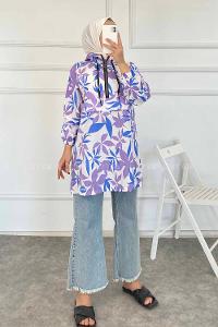 Modalamelif Kanguru Cep Yarım Fermuarlı Çiçekli Tunik Lacivert-Lila