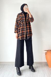 Modalamelif Kapak Çift Cep Detaylı Ekose Oduncu Gömlek Oranj-Siyah