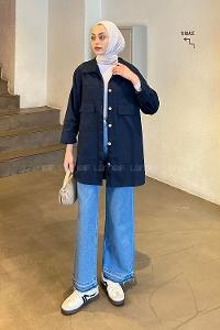 Lamelif Kapaklı İki Cepli Tahta Düğmeli Gömlek Lacivert