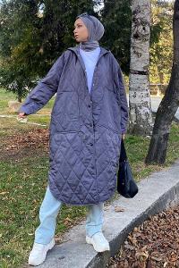 Modalamelif Kapitone Desenli Kapüşonlu Çift Cepli Mont Füme
