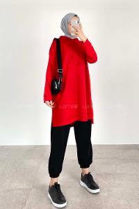 Modalamelif Kapüşonlu Düz Renk Tunik Kırmızı