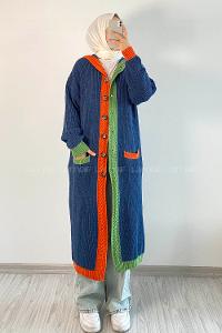 Modalamelif Kapşonlu Garnili Salaş Hırka İndigo