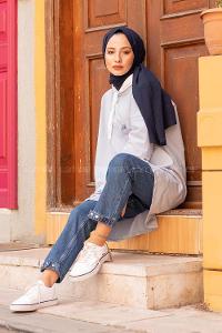Lamelif Yırtmaç Detaylı Sweat Saks Mavisi