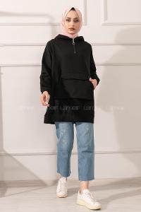 Lamelif Kapüşon Yaka Cepli Sweatshirt Siyah