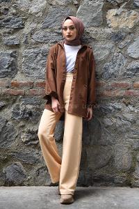 Modalamelif Kapşonlu Lazerli Kot Ceket Acı Kahve