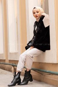 Lamelif Biye Detaylı Tedy Peluş Mont Siyah
