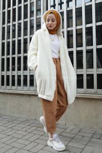 Modalamelif Kapşonlu Peluş Mont Ekru