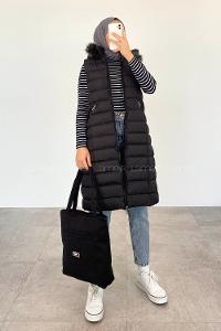 Modalamelif Kapşonlu Uzun Şişme Yelek Siyah