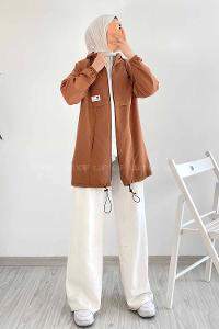 Modalamelif Kapüşon Detaylı Boydan Fermuarlı Hırka Taba