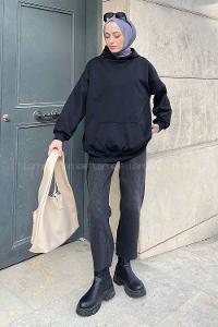 Lamelif Kapüşon Detaylı Kanguru Cep Sweatshirt Siyah