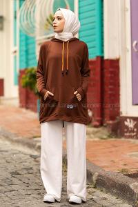 Lamelif Üç İplik Kanguru Cep Sweatshirt Acı Kahve