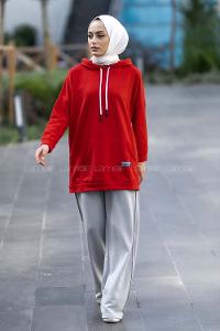 Lamelif Balon Kol Yaka Ve Etek Ucu Manşetli Bol Sweat Kırmızı