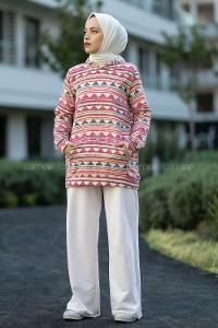 Modalamelif Kapüşon Detaylı Kanguru Cepli Desenli Sweat Pembe-Sarı